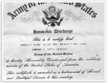 My honorable discharge shows that I was awarded the Bronze Star Medal, Good Conduct Medal (if you can believe that), Distinguished Unit Badge, Combat Infantry Badge, Europe African Middle Eastern Campaign Medal with six bronze stars and bronze arrowhead, and World War II Victory Medal. The six bronze stars represent various battles and campaigns. They were Sicily, Normandy, northern France, Rhineland, and Ardennes, Central Europe.
